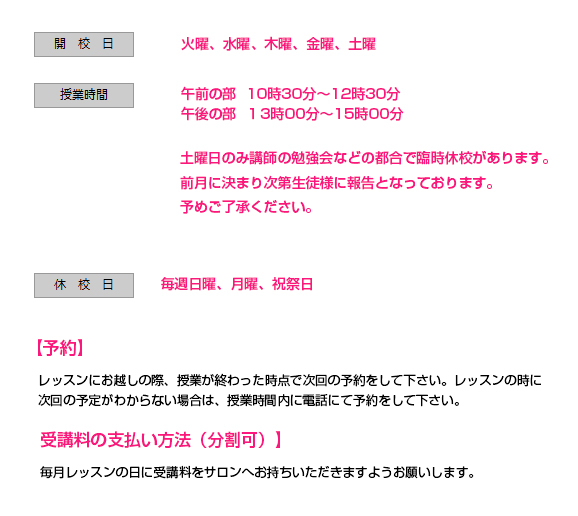 受講料のお支払方法については、一括でお支払いただくほか、毎月3万円からの分割もあります。分割の際は、毎月 お支払いただける日にちを講師と相談にて決め、毎月そちらの日にちと近いレッスンの時にお持ちいただきます。